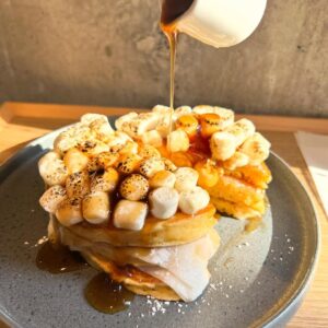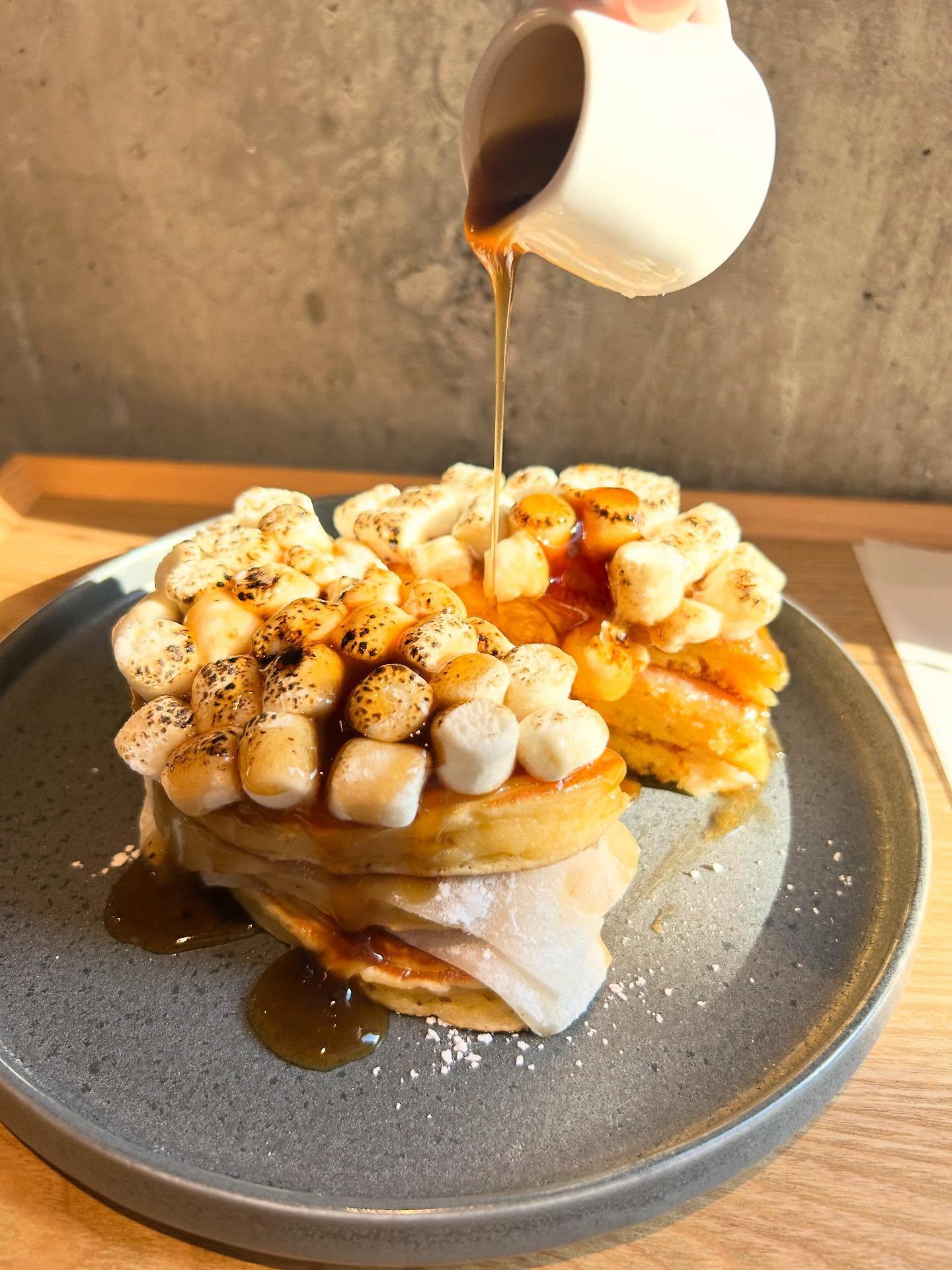 焼きたてのパンケーキに求肥をサンドしバターと炙りマシュマロがとろけるみたらしパンケーキ🥞