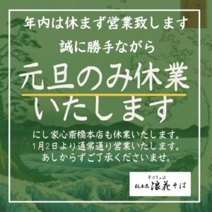 元旦は姉妹店「うどんちり本家 にし家心斎橋本店」もお休み致しますので ご注意ください。